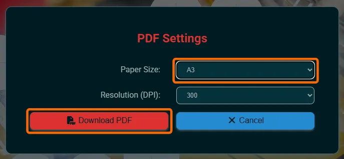 Select the desired paper size (e.g., A3, A4) and resolution (DPI), then click the [ Download PDF] button. The recommended DPI is 300.